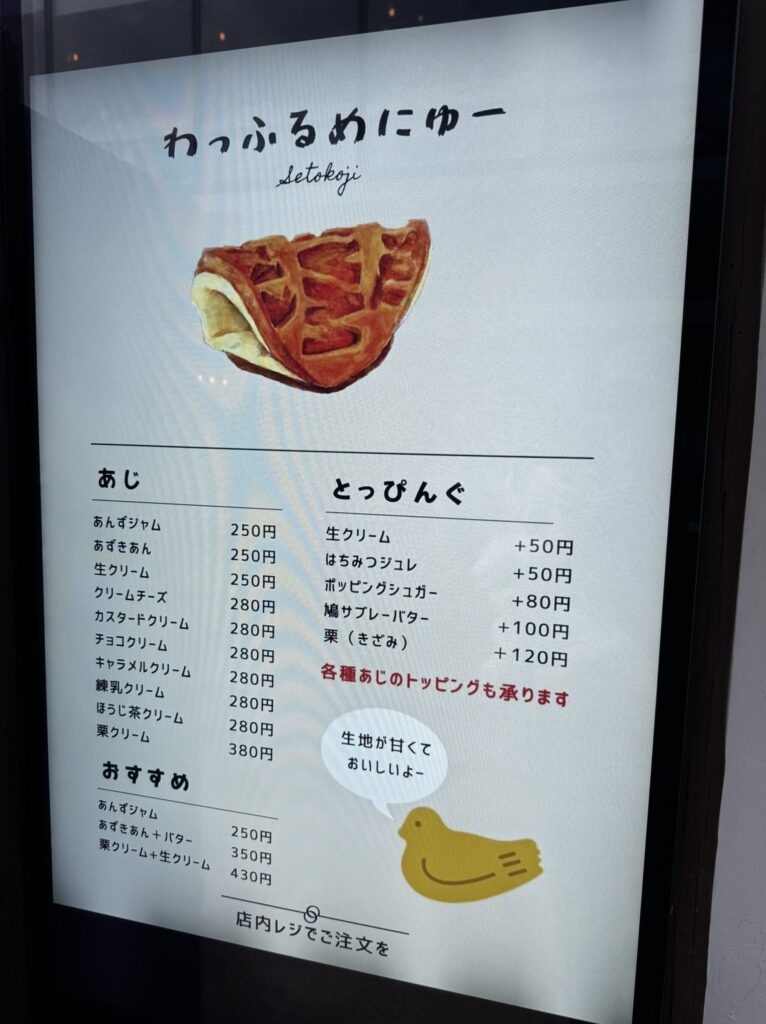 豊島屋のワッフルには、いくつかのフレーバーが用意されています。 定番のカスタードクリームをはじめ、季節限定のフレーバーが登場することもあり、何度訪れても新たな味に出会える楽しみもあります。