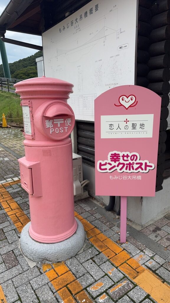 もみじ谷大吊橋の近くには「幸せのピンクのポスト」と呼ばれる観光スポットがあります。通常の赤いポストとは違い、可愛らしいピンク色に塗られており、訪れる人の心をほっこりとさせてくれます。